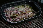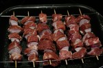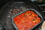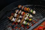 Aus ner alten Auflaufform und ein bischen VA Schweissdraht schnell nen Schaschlikgrill gebastelt. Schweineacken und Zwiebeln abwechselnd auf ungewässerte Holzspiesse gesteckt. In der Form Zwiebeln angebraten, eine in Streifen geschnittene Paprikaampel und ne Dose Tomaten rein. Spiesse drauf und 45 min indirekt grillen. Das Fett vom Nacken tropft schön in die Sosse. Nu die Spiesse kurz über Feuer, für ein paar Röstaromen, angrillen. Anschliessend mit Paprikapulver bestreuen und auf Tauchstation schicken. Das ganze für 1,5 Stunden. Ein paar Veggie und Wurstschaschliks für Frau und Kinder kommen auch noch mit rein.