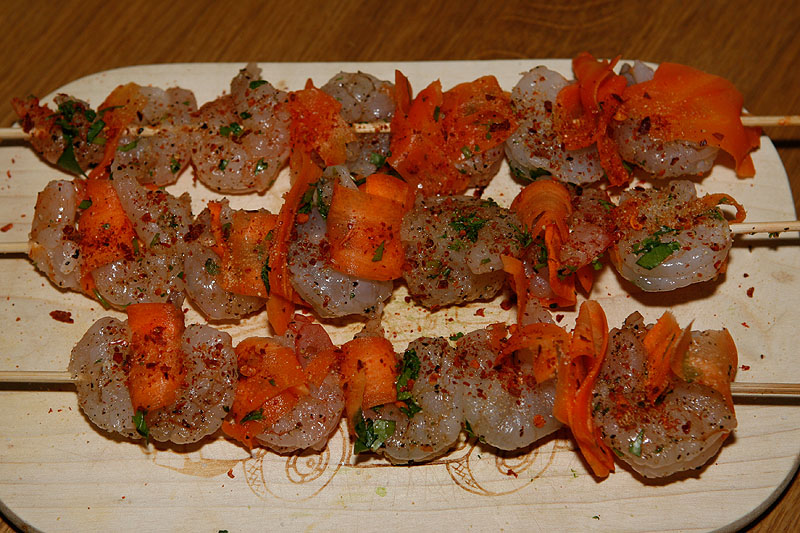 Veröffentlicht am Mai 24, 2011 mit 800 × 533 in Garnelenspiesse mit Möhren und Blätterteigkäsetürmchen