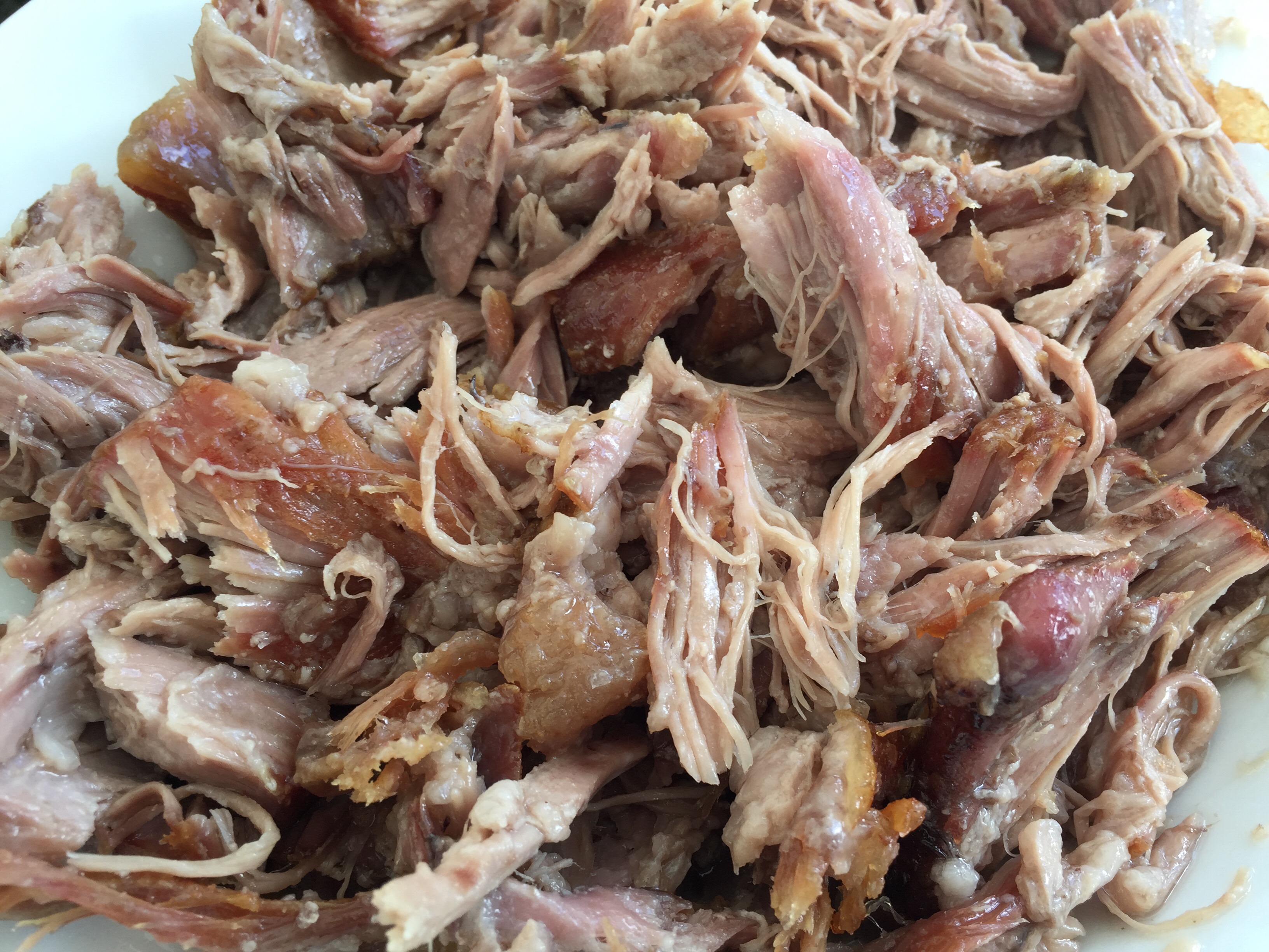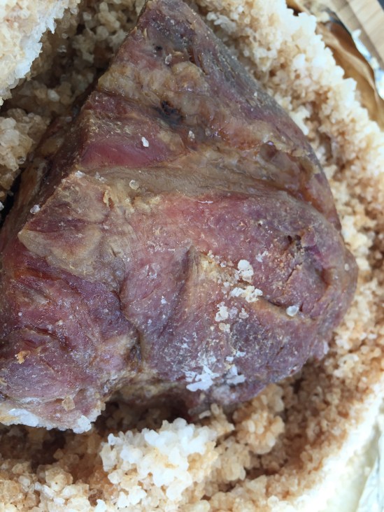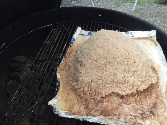 Grobes Meersalz mit Eiweiß vermischen. Schwein rein (Schulter oder Nacken ohne weitere Gewürze) und auf den Grill. (Habe Backpapier unterm Salz/ Das Salz löst Stoffe aus der Alufolie, die ich nicht am Essen haben möchte). Bis 92 oder 93 Grad KT ziehen lassen. Rupfen, futtern!
