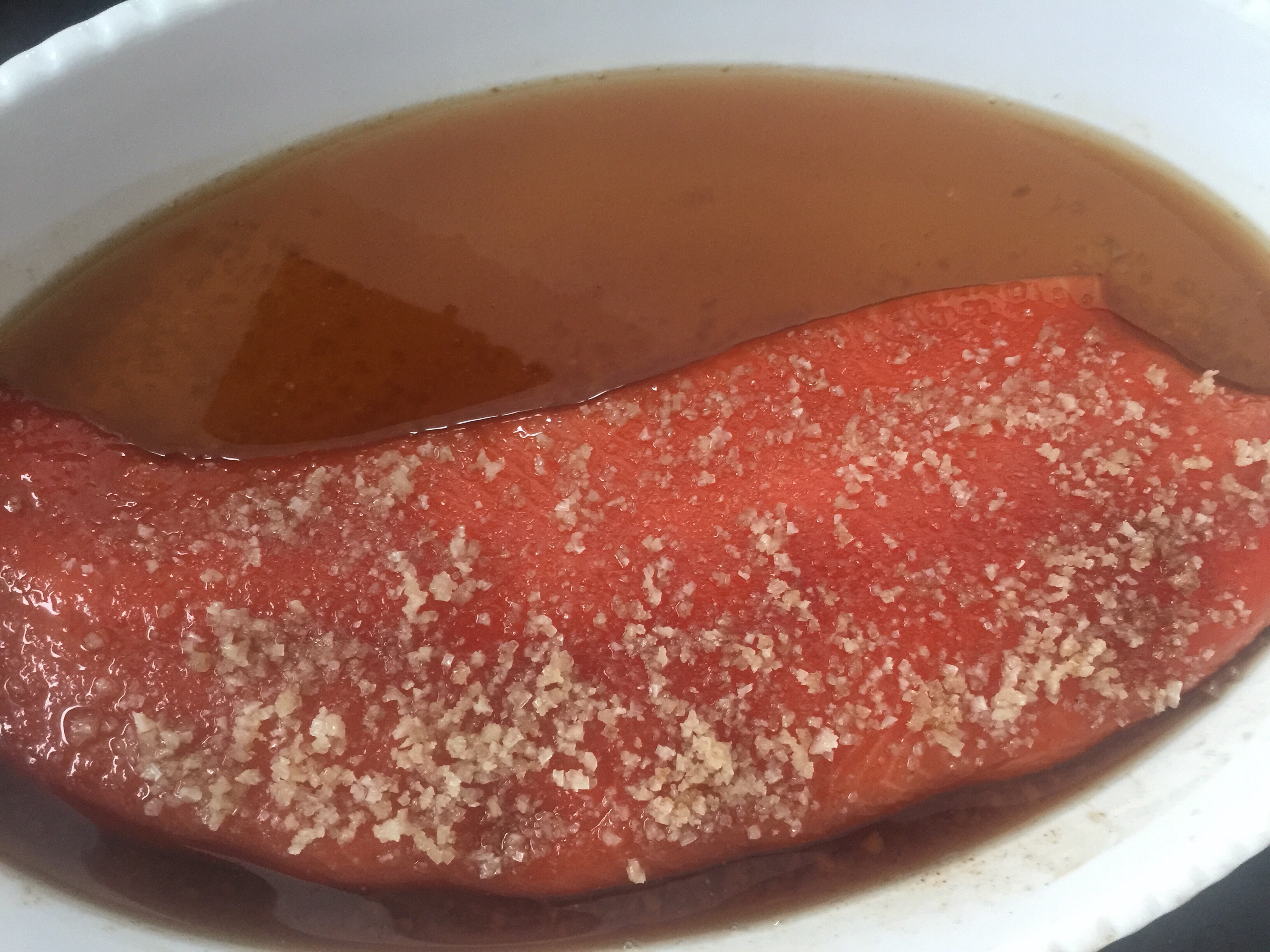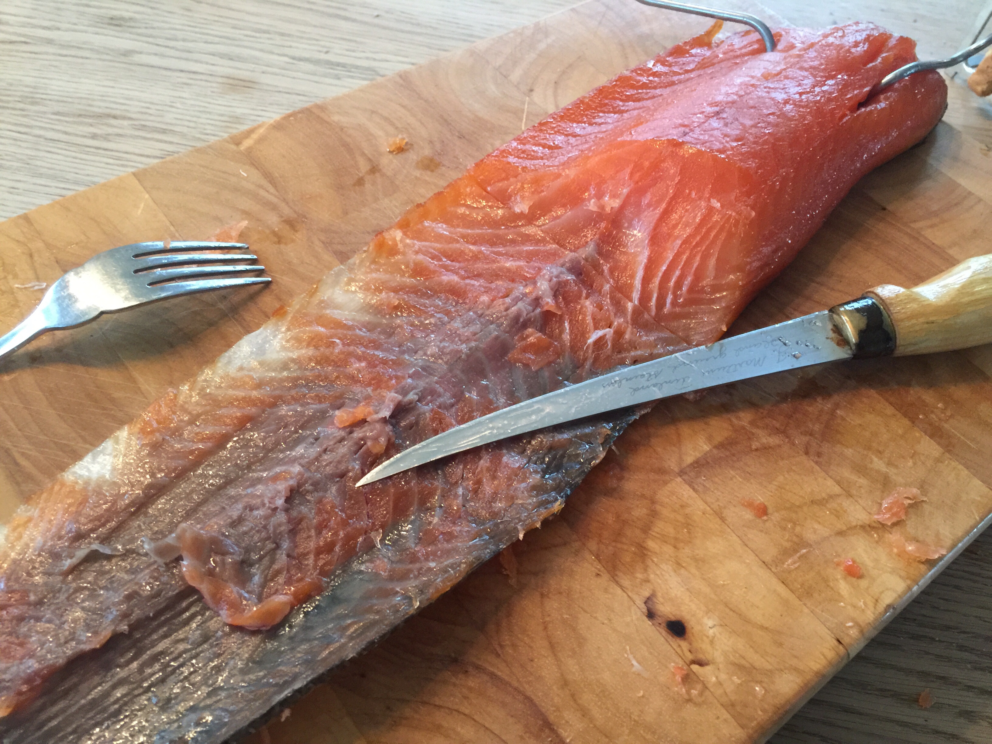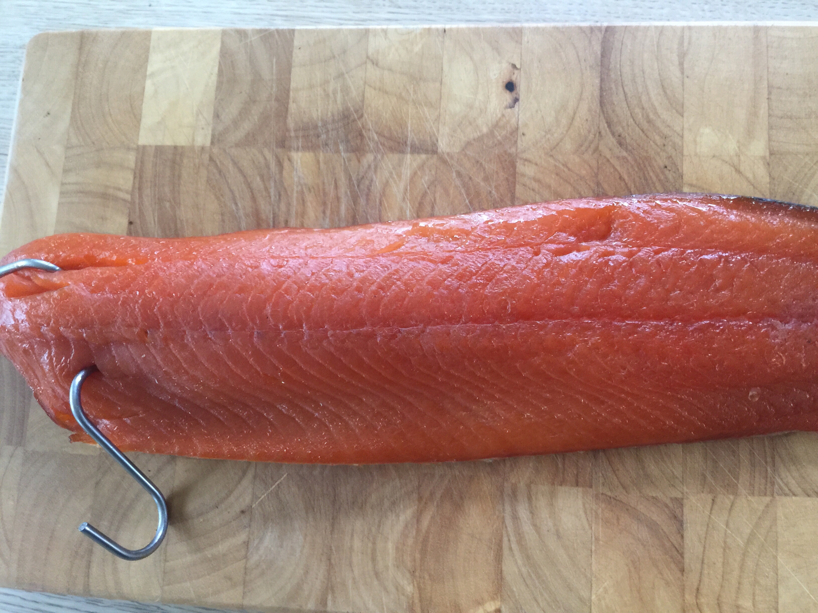 24h mit braunem Zucker und Meersalz gebeizt. 1 Tag trocknen lassen und anschließend 24h Kaltrauch. Danach noch was hängen lassen und fertig! In hauchdünne Scheiben schneiden…