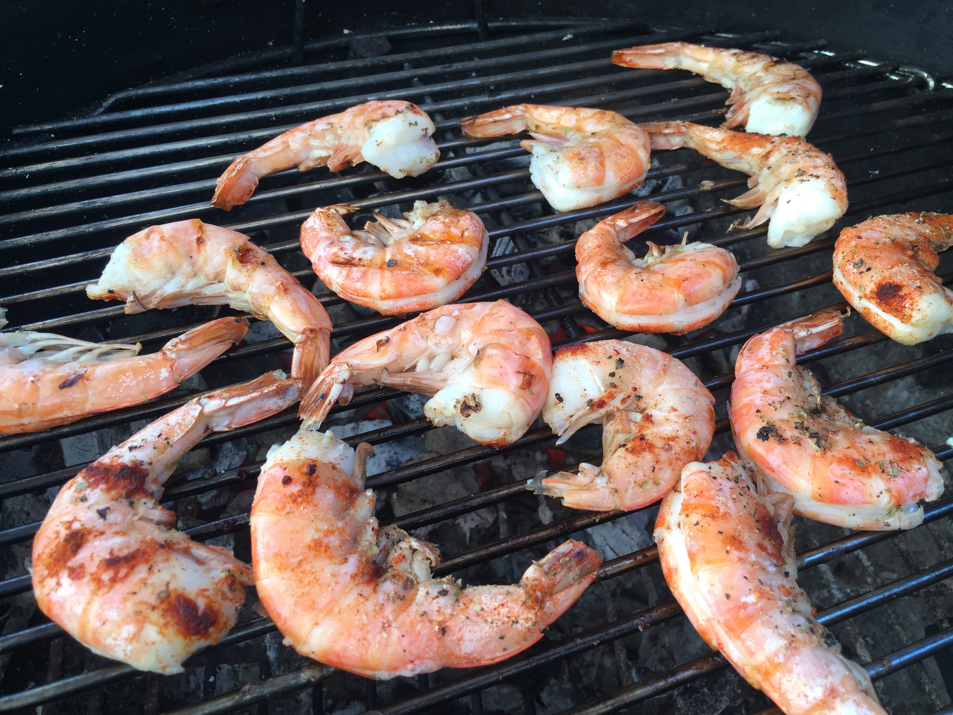 Rinderhüfte und Tigers auf Spiesse gezogen. Gesalzen und gepfeffert. Gegrillt.