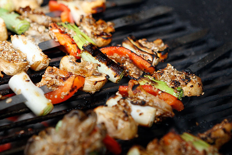 Als Beilage im Wok gegrilltes Gemüse, ein aus der Marinade gezaubertes Sößchen und Glasnudeln.