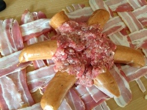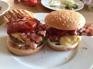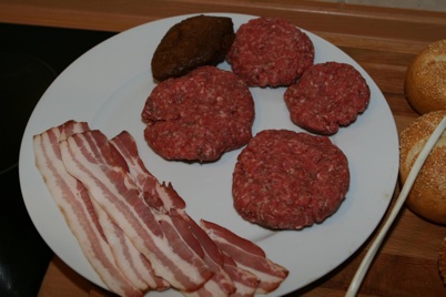 Bacon, Zwiebeln, Gurke, Tomate, 1 Blatt (nicht mehr) Salat, Barbecuesoße und nen guten Schuss Hot Mamas Habbisößchen.