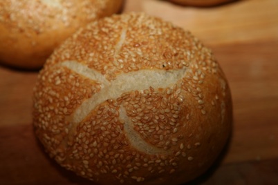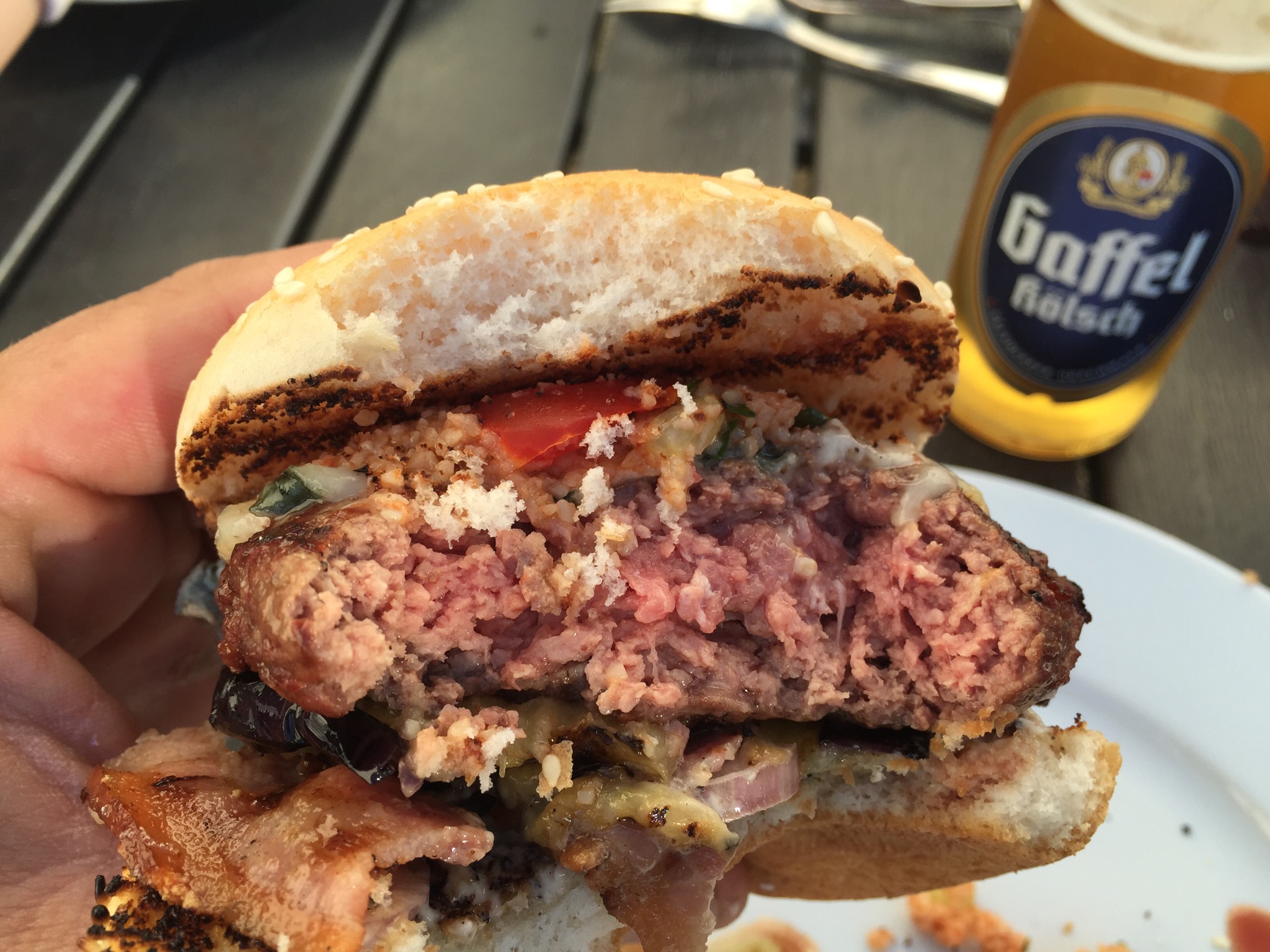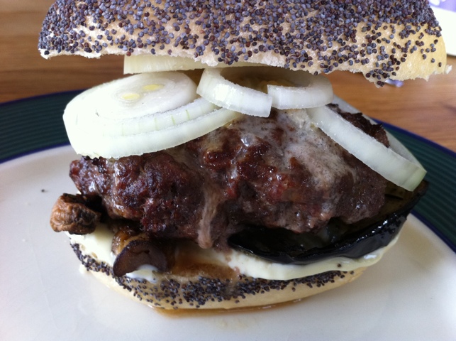 Der fertige Burger: Sesambrötchen, gegrillte Aubergine, Bacon, Fleisch mit Gorgonzola, Zwiebelringe und Aioli Spezial!