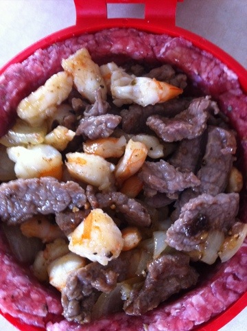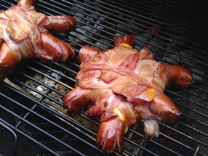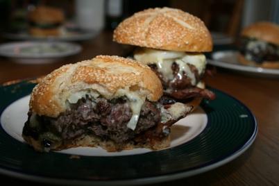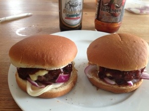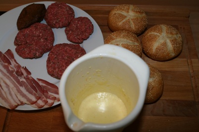 Rinderhack mit Salz und Pfeffer gewürzt, Cheddar, irgend nen Käse mit roten Krümmeln drin, für die Optik, Jalapenos, Habaneros in frischer oder getrockneter Form für den Kick. Bei Bedarf ne BBQ oder Käsesoße.
