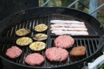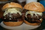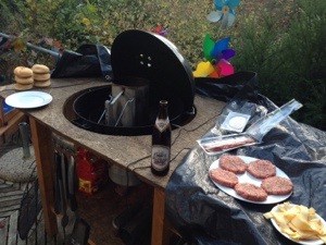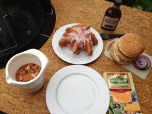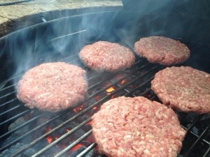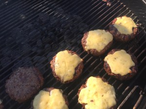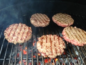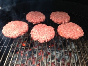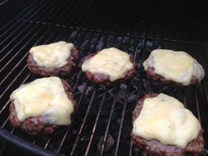 Smoker mit Buchenholz auf über 300 Grad angeheizt. Patties medium gegrillt.