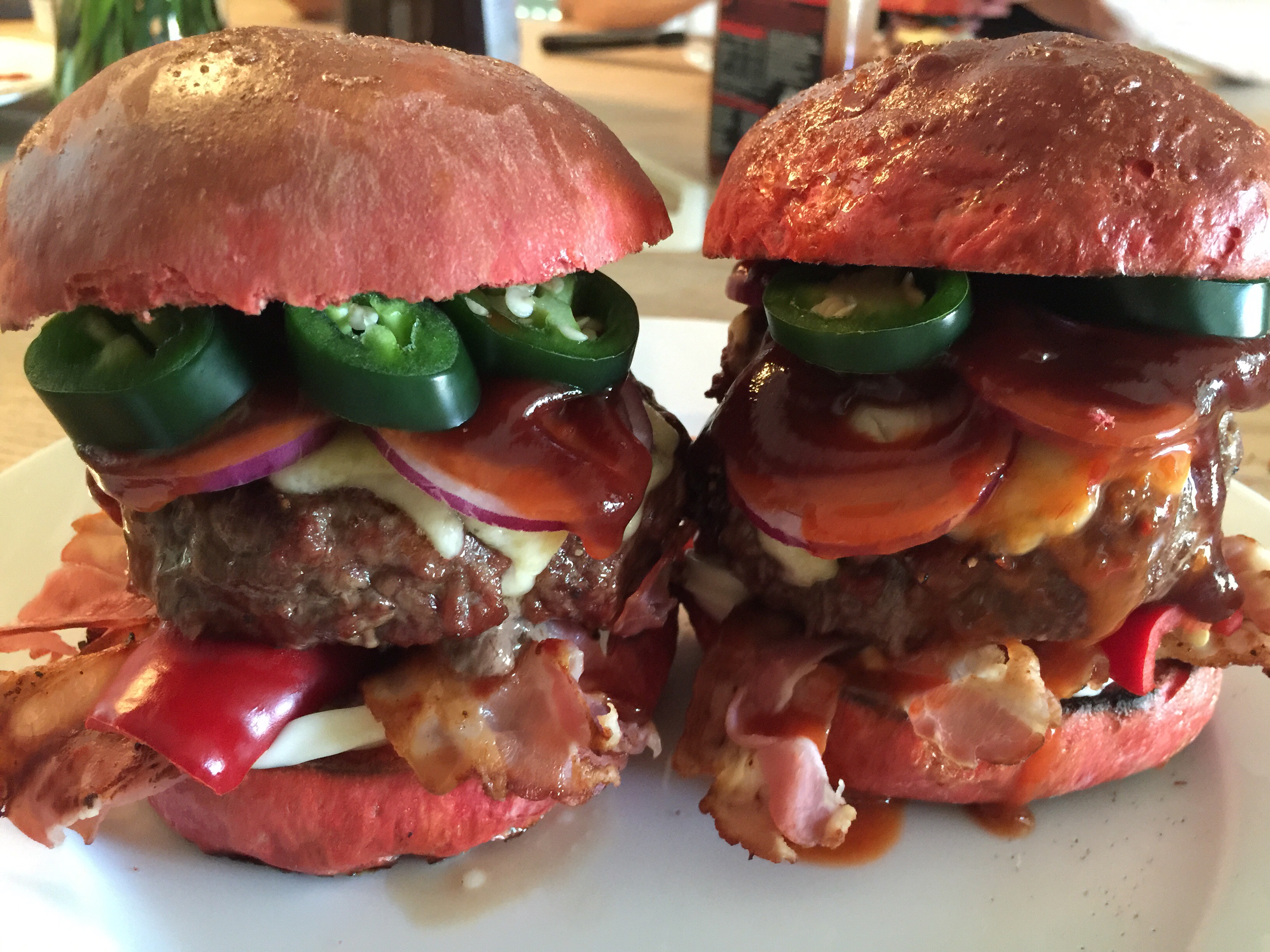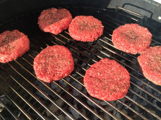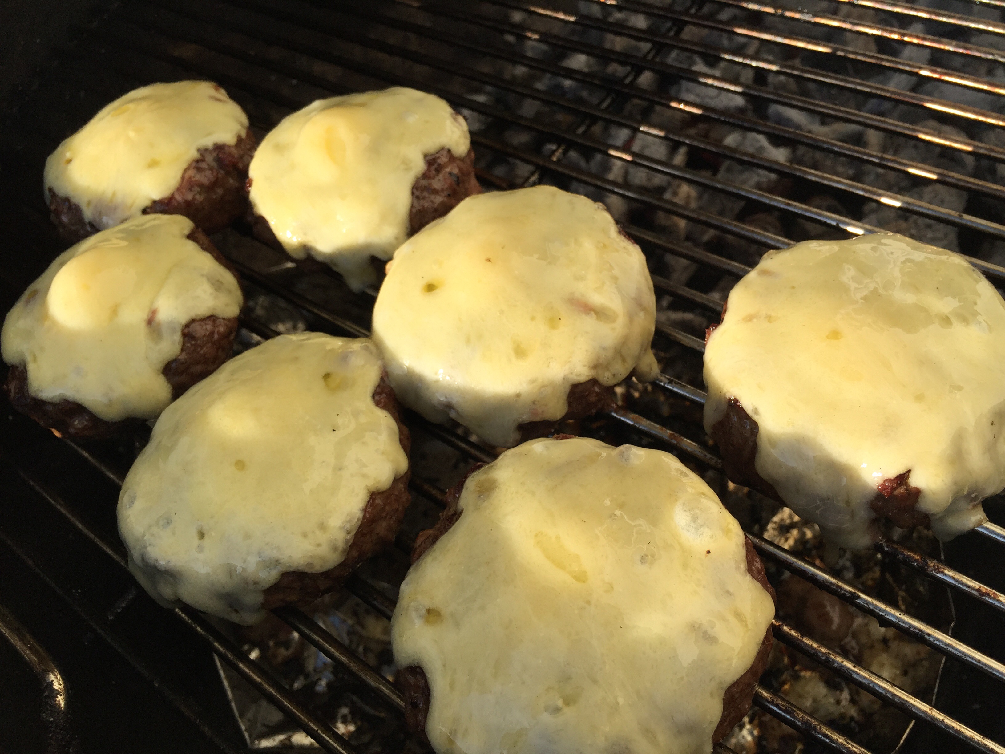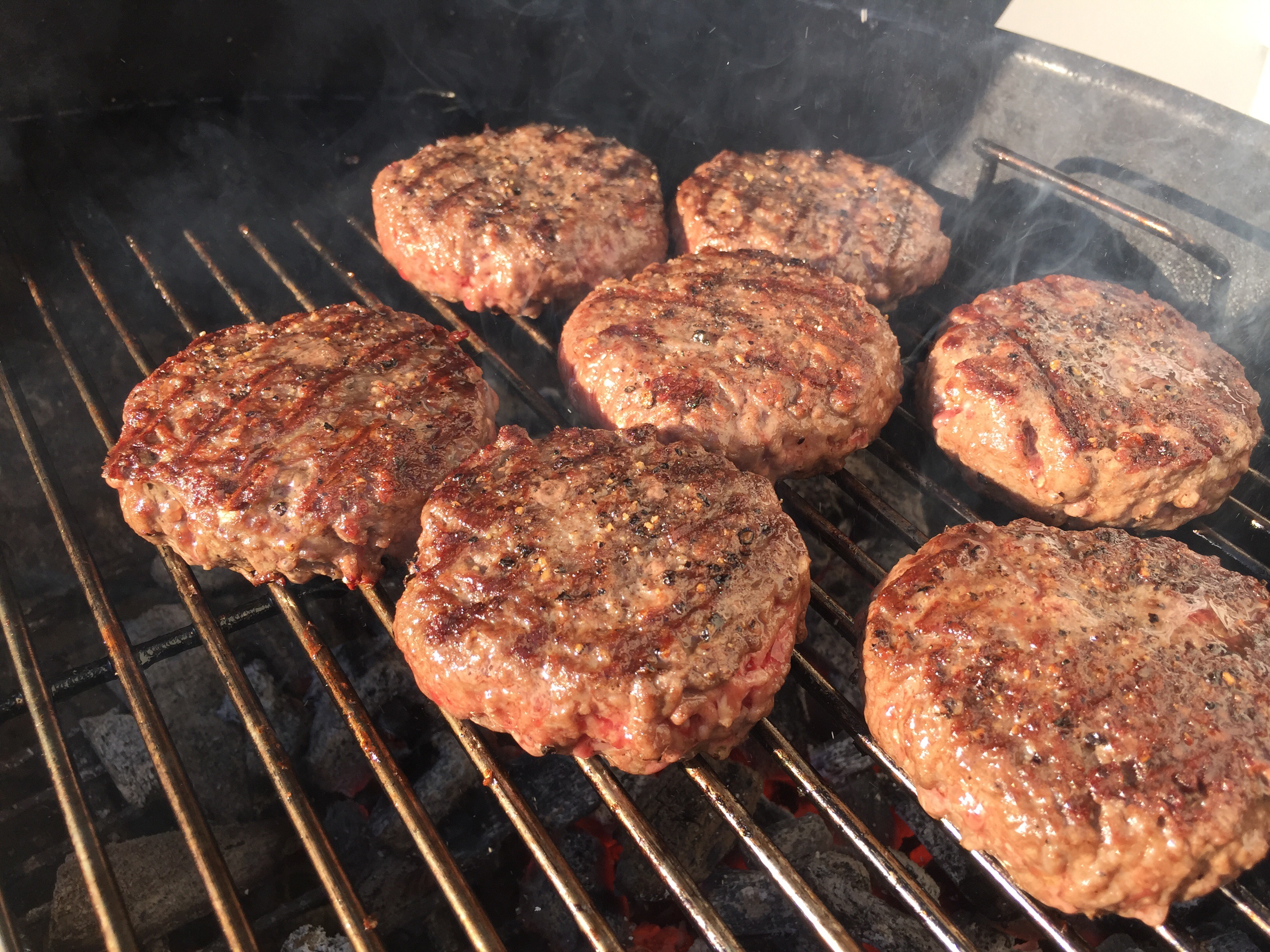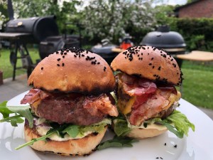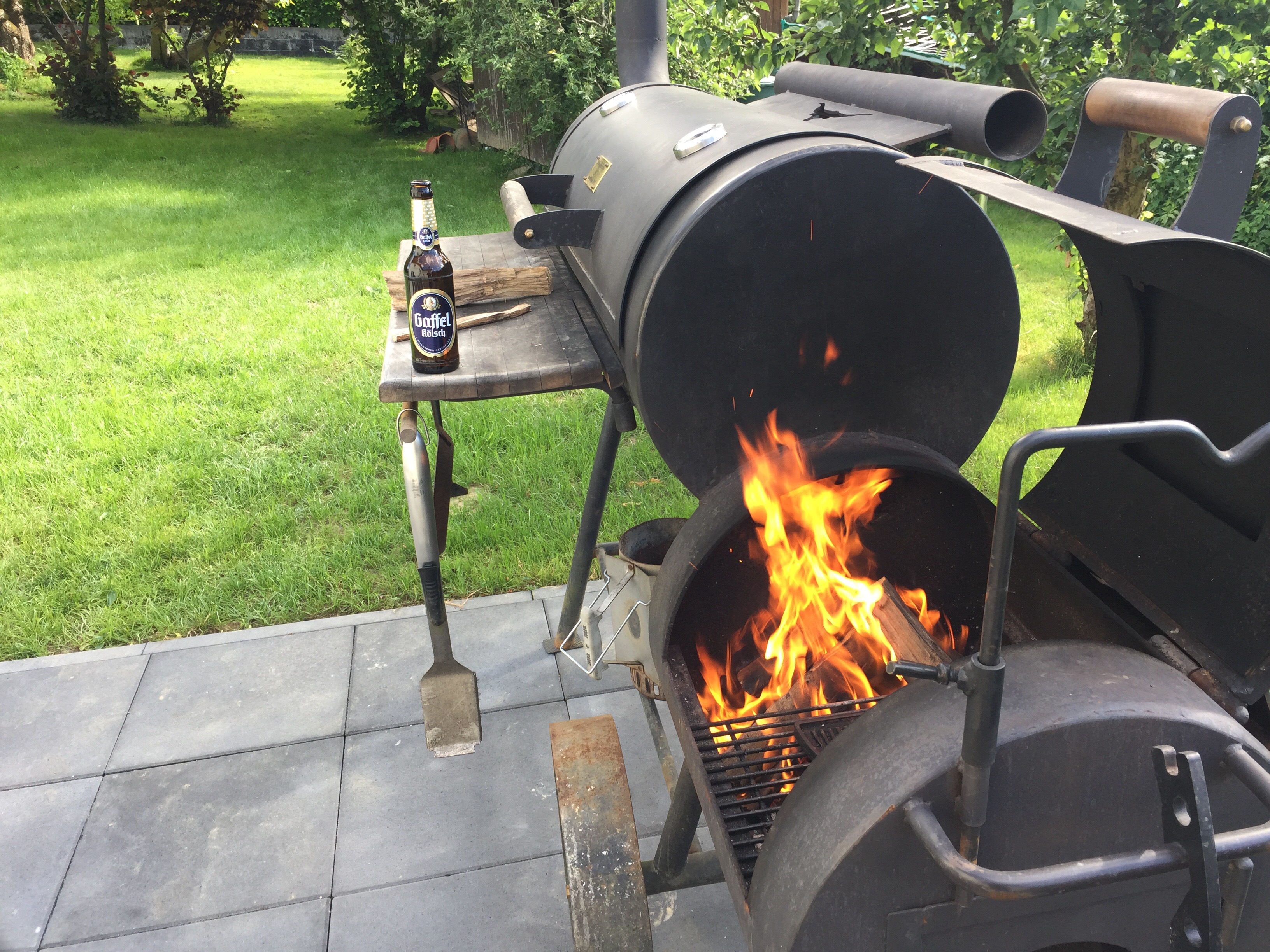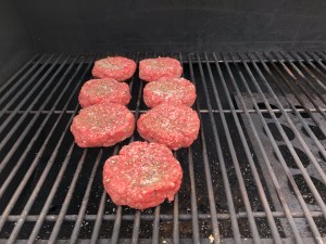 Smoker mit Buchenholz auf über 300 Grad angeheizt. Patties medium gegrillt.
