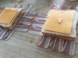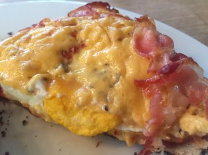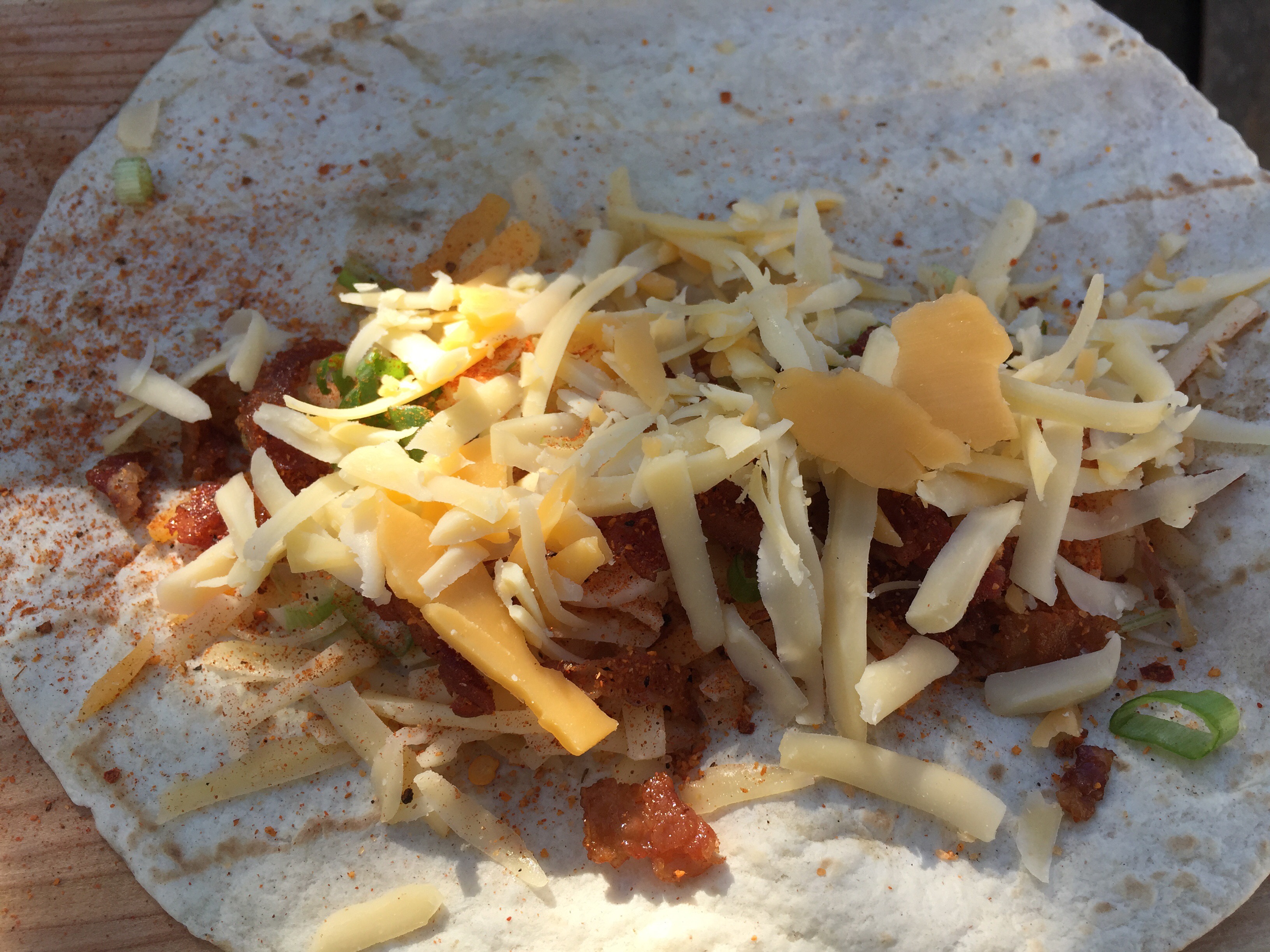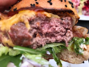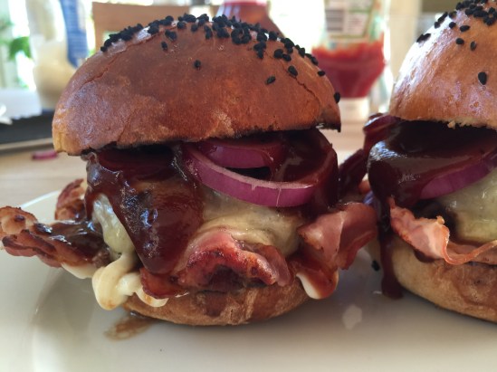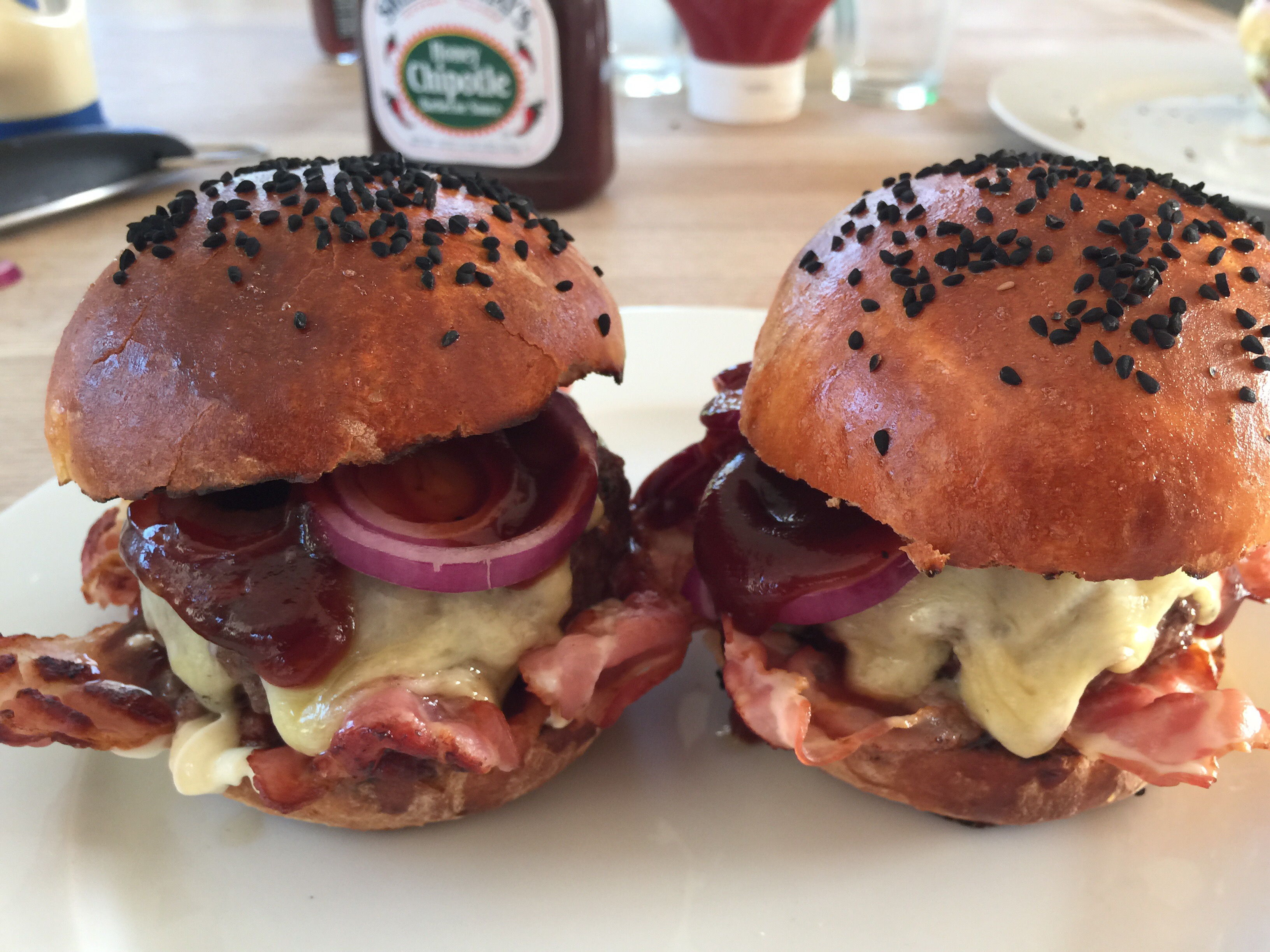 Zutaten nach Geschmack: Bacon, Zwiebeln, Salat/Ruccola, Cheddar, Aioli (hausgemacht), BBQ Sauce (hausgemacht), Chilis