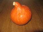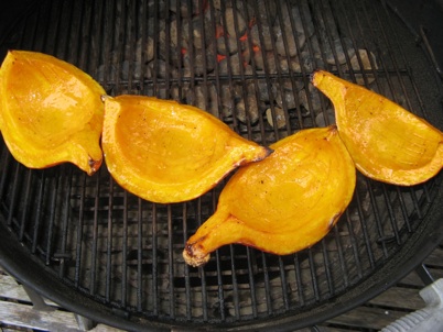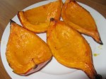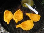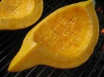Hokkaido Kürbis geviertelt, entkernt, geritzt, leicht gewürzt mit Salz, Pfeffer und Muskat.