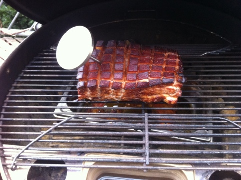 Rippchen enthäutet und über Nacht in Kirschsaft eingelegt. Am nächsten Tag mit ungarischem Kirschschnaps bepinselt und mit Salz, Pfeffer und Paprika gerubbt. Mit Kirschholz 3 Stunden geräuchert, 2 Stunden in Jehova ziehen lassen und die letzte Stunde mit nem Glaze aus u.a. Kirschmarmelade bepinselt.