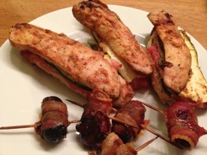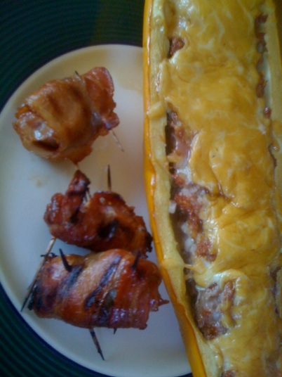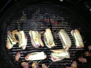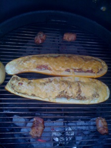 Mit Hackfleisch, Zwiebeln etc. gefüllte  Zuchini. Mit Käse überbacken („übergrillt“) und leicht mit Apfelholz geräuchert.