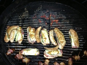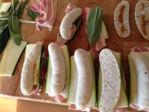 Die „Blue Flame“ Weißwurströllchen in Stapel umgemogelt. Die voll der Pelle befreiten Weißwürste in Scheiben geschnitten und abwechselnd mit süßem Senf, Zuchinischeiben, ein wenig Salbei und Bacon belegt. In der Schlußphase mit süßem Senf bestrichen. Dazu ein paar Speckdatteln.