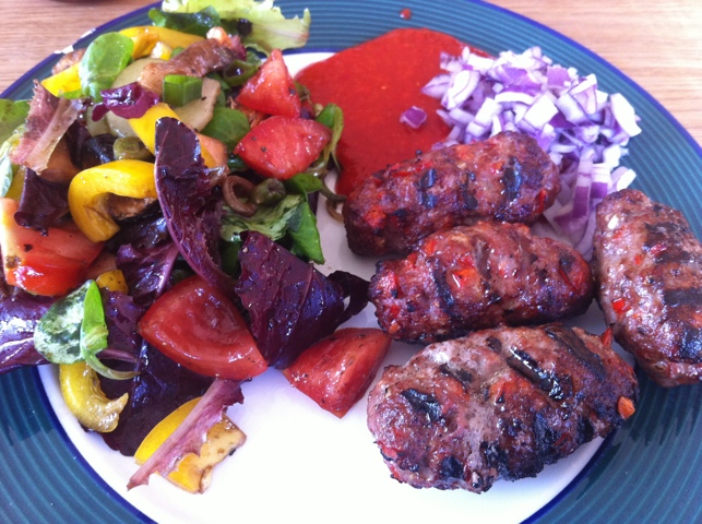 Zutaten nach Geschmack: Bacon, Zwiebeln, Salat/Ruccola, Cheddar, Aioli (hausgemacht), BBQ Sauce (hausgemacht), Chilis